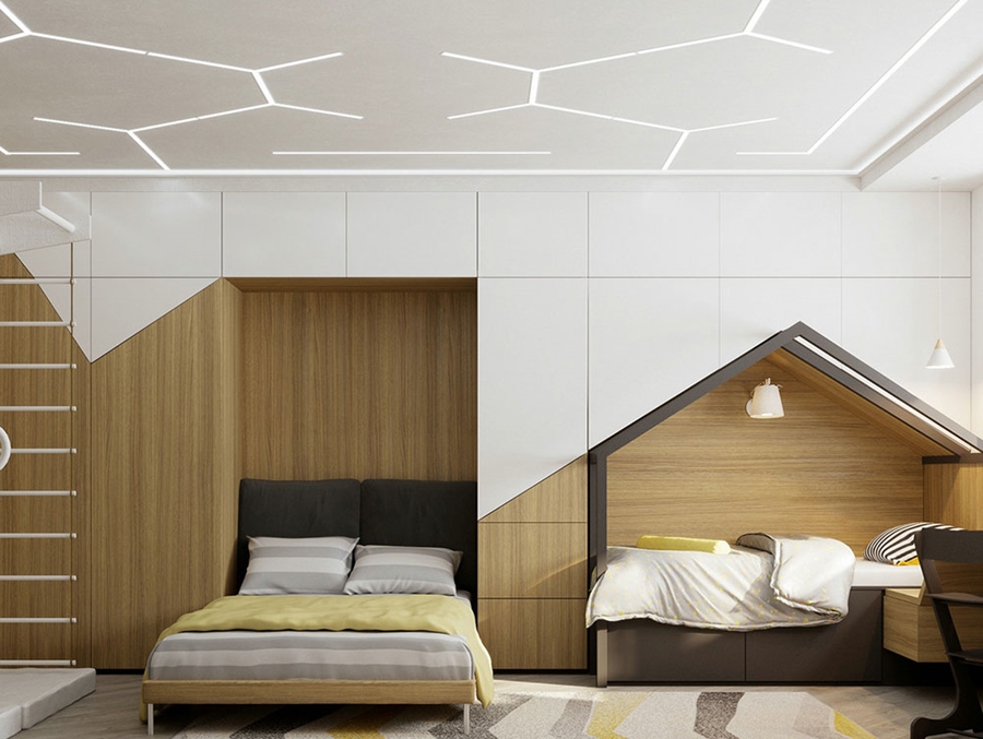 設計師在這里將暖色系運用到了極致。原木的墻面和床頭,帶有一絲暖意。兩個白色線條吊燈,又使整體活潑起來。白色的小夜燈放置在床上,享受片刻的安寧。白色天花板上隱藏著不規則的燈,保證了很好的采光性,視野也變得開闊起來。