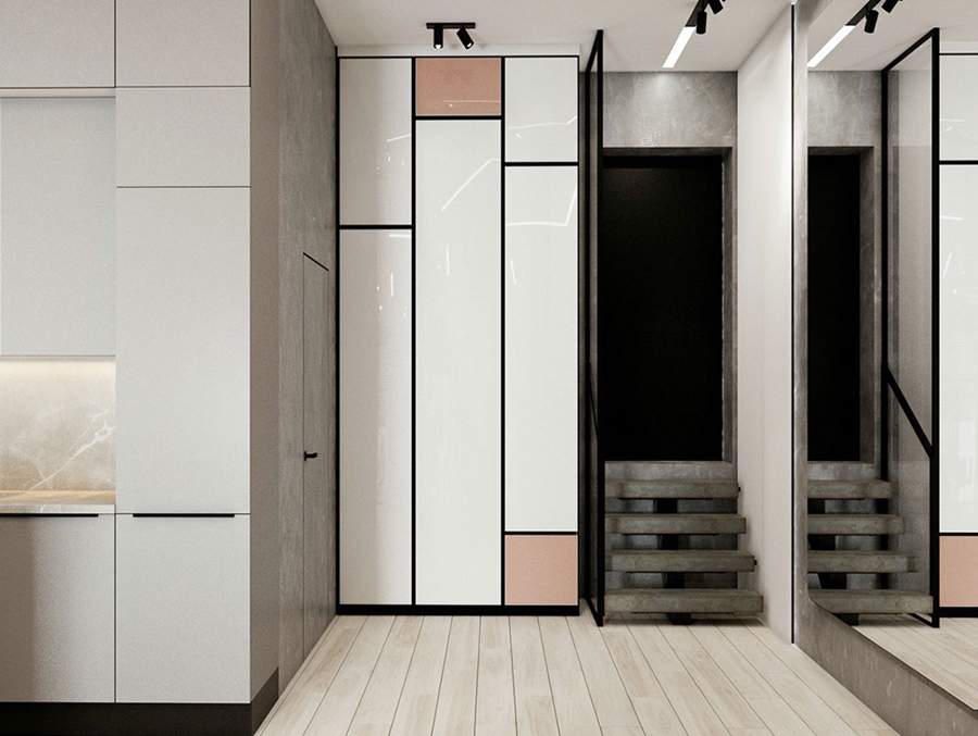 玄關處用極具設計感的立柜,幾何圖案讓整體顯得清爽,簡潔。少許顏色的點綴,加入一些設計感在里面。