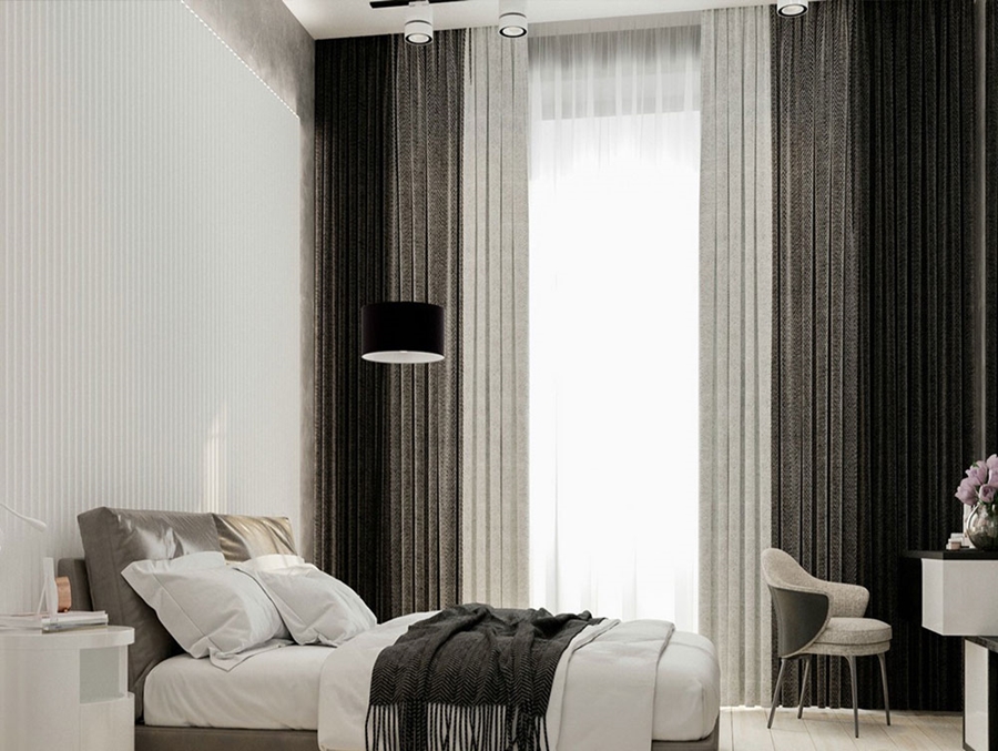 主臥的方形的窗戶,采用了半透明的玻璃。保證陽光可以照射進來的同時,又保護了房間里的隱私性。銀灰色窗簾同床品的色調相輝映,整體設計具有和諧的美感。