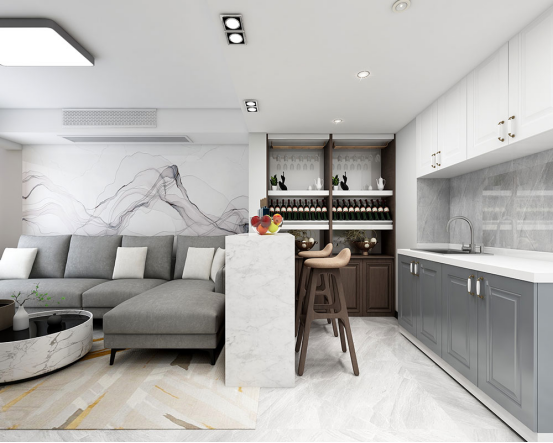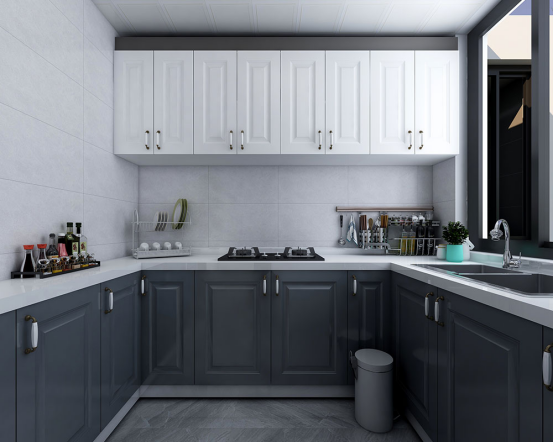 U型廚房,動線合理,減少做飯的來回的距離。選用鋼化石英石臺面,方便擦洗。