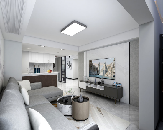 暖灰質感的乳膠漆墻面為空間確定了大基調,相對于純白,反而給出一股溫暖的筆觸。電視墻石膏板和乳膠漆結合,簡潔明了,舍棄繁瑣的裝飾,風格簡約。定制地柜,可以收納遙控器等客廳小件物品。