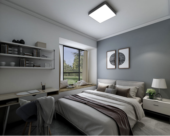 綠色條紋床品與北歐淺灰花色大理石,為空間增添了一份自然恬靜之感。定制床頭柜,方便放置書籍,滿足主人的睡前閱讀習慣。