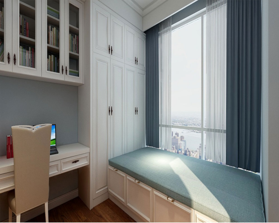 書房的藍色月白色書柜的組合,書柜的優(yōu)美線條,榻榻米是一個很好的休息空間!