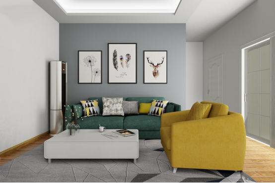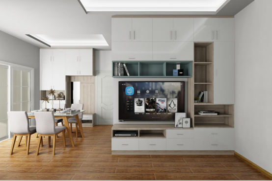 灰色簡潔的背景墻和整面的電視柜講客廳分割,讓立面結構具有層次,用相對簡單的做法營造墻板的效果;頂面兩層石膏線的鋪貼將氛圍渲染開來。陽光透過紗簾灑在地面上,又是美好的一天。