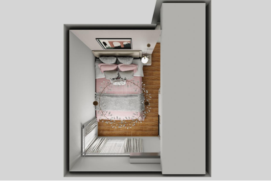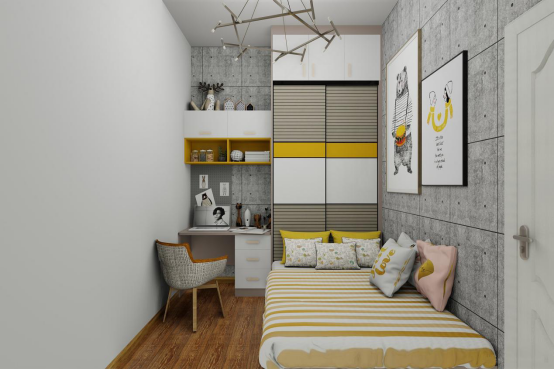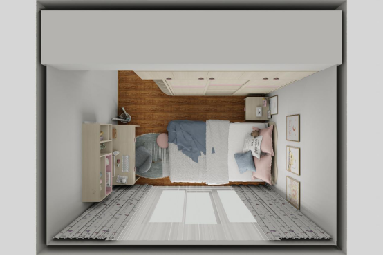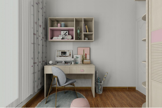 未來寶寶的房間,勿忘草藍充盈了整個房間,清新、爛漫,這是屬于小朋友自己的小世界。旁邊的衣柜兼具儲物,書桌功能,那薄薄的小抽屜拉開后便可以用來寫作業啦。