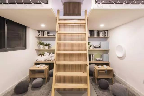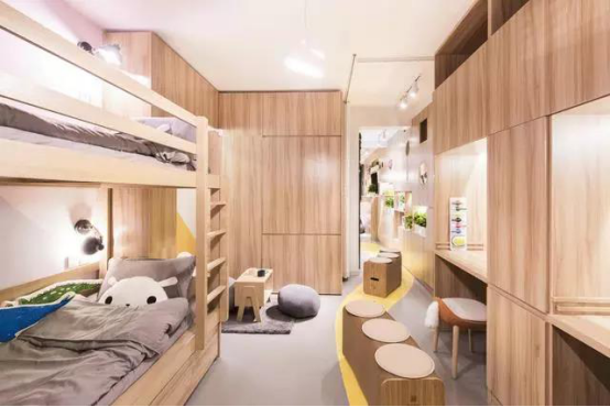 從陽臺看過去室內,這個是女孩子的臥房,一面是上下床,一面是上下式書桌柜,非常具有功能性。