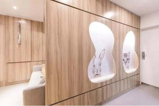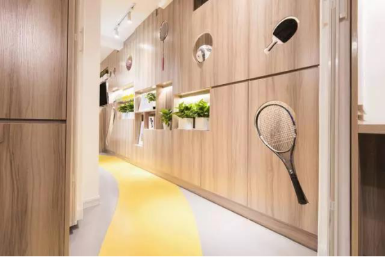 雖然玄關一整面都是柜子,但是柜子也很具有趣味性,可以鑲嵌放入孩子們的運動器材。