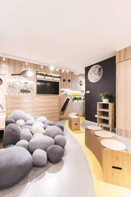 客廳雖然小,但是活動空間顯得非常大,鵝卵石的抱枕活動區,大面積的黑板涂鴉墻,都能帶來很多的趣味性。