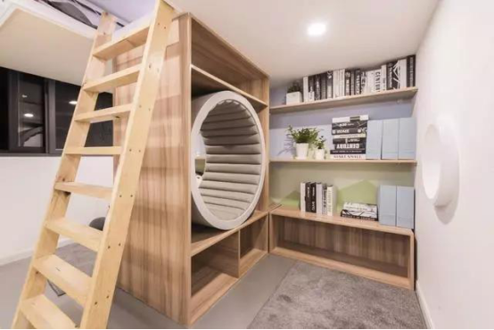 頂面的支撐還有下面這個對景的圓洞造型柜子,可以放置物品,也能作為一個趣味性的游樂場,自己的房間就能享受到公園或者是兒童樂園的攀爬圓洞的玩具。