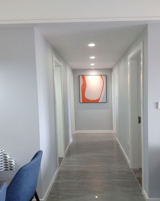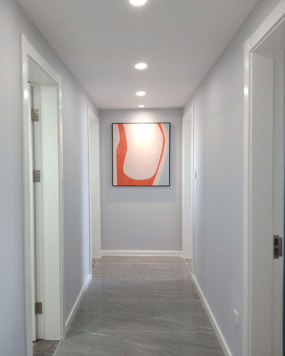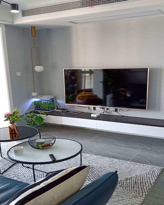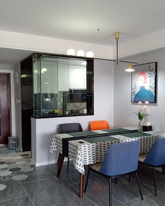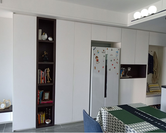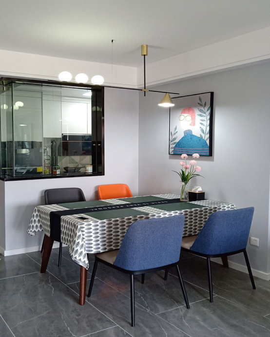 本案業(yè)主是一對年輕夫妻,喜歡簡潔大方。整體空間淺色系搭配,設(shè)計師根據(jù)業(yè)主的喜好,灰色,原木色,海蘭灰,局部白色相映襯,綠色鮮艷跳色進行渲染,畫龍點睛,活躍空間,同時為了使空間不那么冷淡,壓抑,墻面墻布色彩采用中性暖灰色,以及淺灰色為主。 在大眾的眼里,現(xiàn)代簡約風(fēng)是不太接地氣的,現(xiàn)代簡約適合的人群:甚或標(biāo)準(zhǔn)較高、居住習(xí)慣較高,居住習(xí)慣十分自律。這對業(yè)主夫妻,兩個人正好就屬于這類人,生活習(xí)慣非常好,會每天早起鍛煉,定期收納。對房屋整潔有高要求,希望打掃方便,家里陳設(shè)一目了然。 故而當(dāng)設(shè)計師提出現(xiàn)代簡約風(fēng)時,一拍即合。整間房屋基本上就運用了灰、海蘭灰、原木、白、四種基調(diào)。色彩是低飽和度,燈光的加持,故整個空間顯得很舒適。