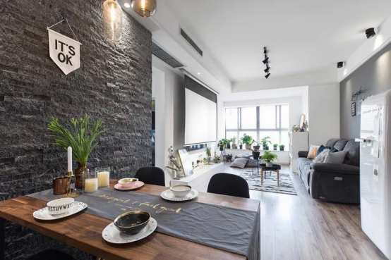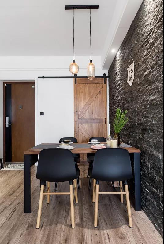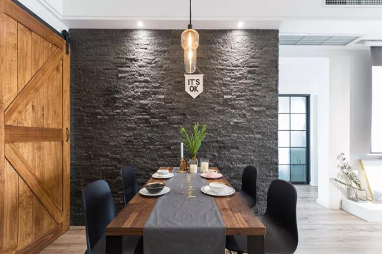 餐廳的墻用黑色文化石飾面,讓整個空間的色彩有了變化,也使餐廳成為一個獨(dú)立的空間,原木和黑色結(jié)合的餐桌與椅子,既有生活的樸素也有踏實(shí)的溫暖。