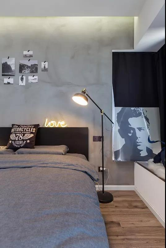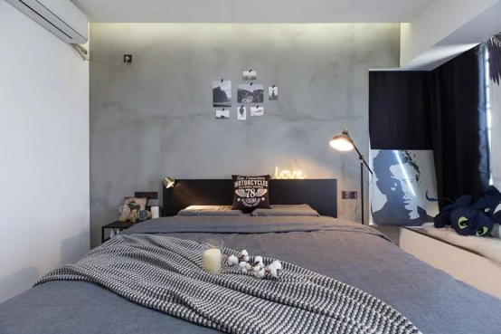 床頭干凈的水泥墻,讓整個空間顯得純凈立體,墻體與淺灰整潔的床單相應(yīng)成章,床頭的臺燈透出沁人的暖黃,淺灰的床單是安寧的船港,床頭的灰墻是潔白空間里跳躍的樂章。