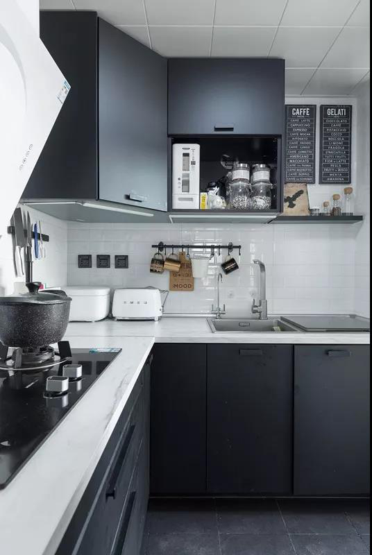 黑色的櫥柜貯藏生活的溫暖,白色的油煙機(jī),抽走煩惱的云煙,黑色的地板同櫥柜一起構(gòu)建了穩(wěn)重的步伐,簡潔的空間,生活顯得寧靜悠遠(yuǎn)。