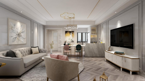 沙發背景墻是簡單的石膏線條,用裝飾畫做點綴突出時尚感,用線條的立體感、體現整體的淺色調,