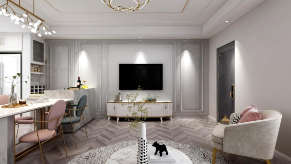 電視背景與沙發背景的線條相呼應,形成視覺的統一。