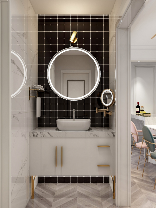 干濕分區,防止干區淋濕,同時又能提升整體的通透性,墻上鋪貼的黑色馬賽克瓷磚視覺上拉伸空間,增強層次感。