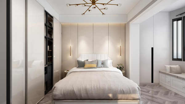 人字拼接的地板,香檳色硬包的床頭背景,金屬材質的燈具以及軟包床頭的家具,提升整個空間質感的同時,多一些成熟和穩重,更加符合屋主人的氣質。