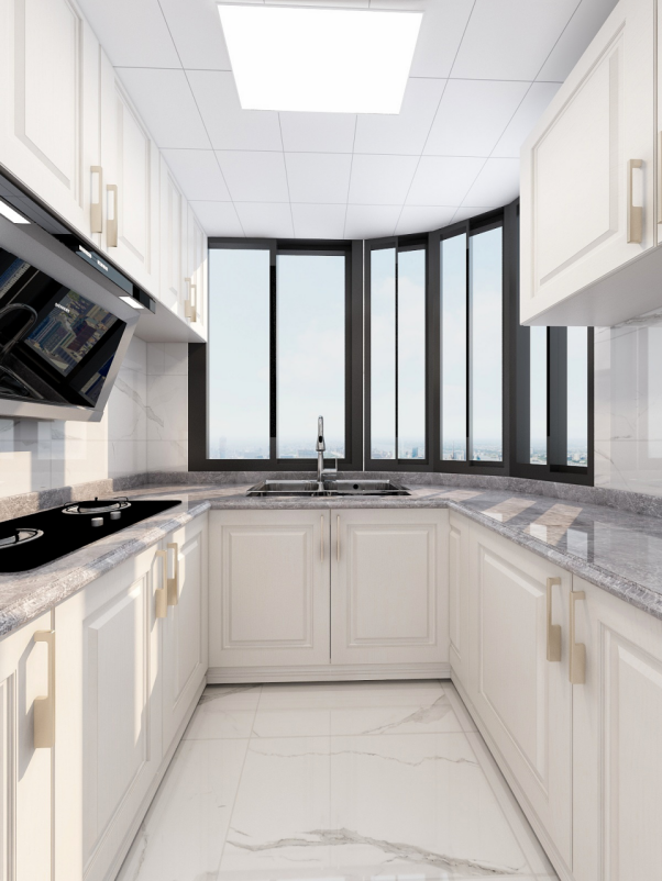 調整后的廚房面積縮小,U型操作臺滿足烹飪操作和儲物的需求