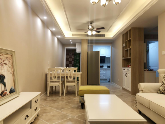 在客戶需求上將原來的三房格局改成兩房格式,使得主臥空間有一個超大衣帽間和書房。為了增加廚房使用空間,將冰箱放置于鞋柜后面。增加廚房臺面的同時也增加了玄關鞋柜的儲物空間。