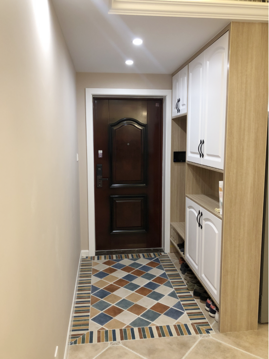 進門玄關設置了換鞋凳和鞋柜,方便換鞋同事也增加鞋子的存放空間。地面玄關拼花,突出小而美的簡美風格。