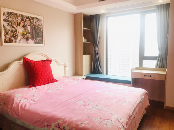 梳妝臺的配色延續了所有柜子的顏色,原木色。主臥的空調外機處有一個尖角,利用書架+內飄窗+梳妝臺的形式使得空間利用更加合理。