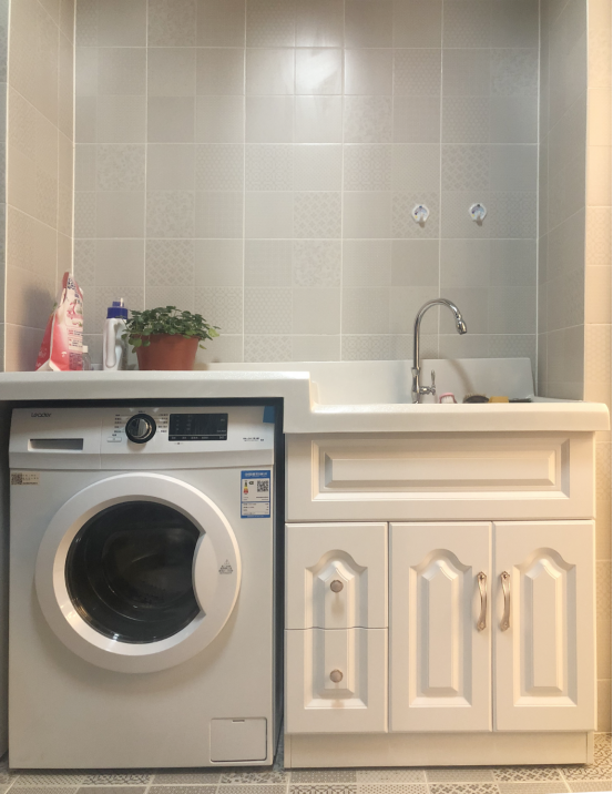 衛生間干濕分離,臺盆后面嵌入餐邊柜增加儲物。