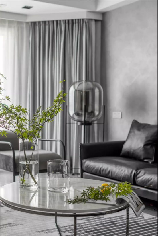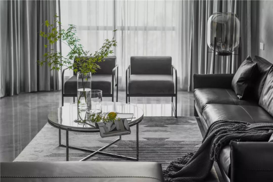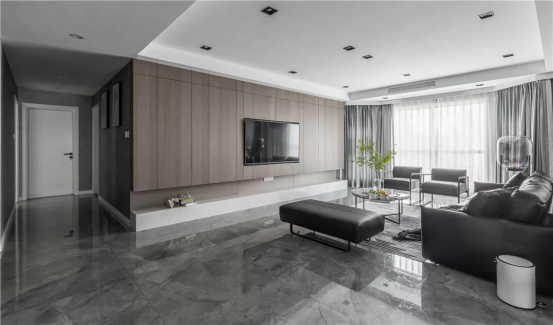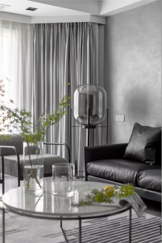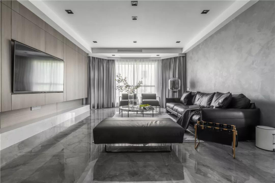 ▲整個客廳以灰色地磚與墻面基礎,搭配黑色皮沙發,呈現出一個高冷簡約的空間感,顯得年輕低奢又檔次。