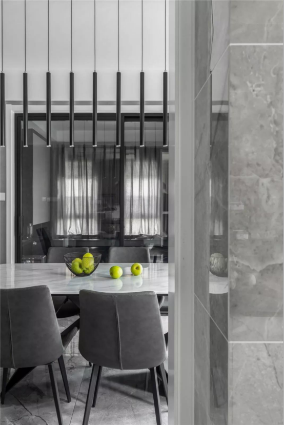▲餐廳整體也是一灰色調的硬裝空間,中間布置一張大理石質感的餐桌,頂上一排垂下的長條吊燈,營造出一個時尚大方的空間感。