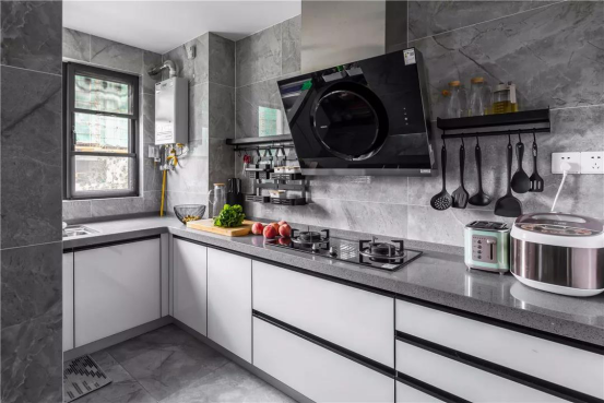 ▲廚房以灰色墻地面磚,搭配白色櫥柜,油煙機兩側都裝了吊架,讓日常做飯的廚具都有方便的收納存放位置。
