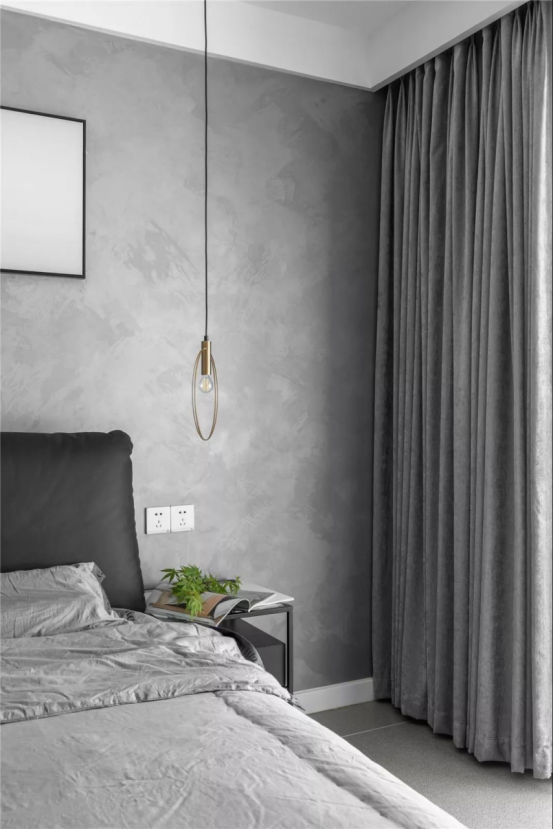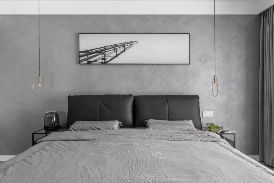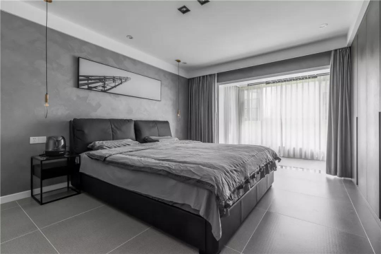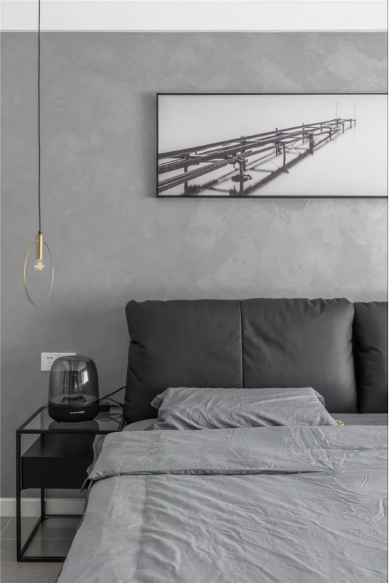 ▲主臥在灰色墻與地面磚、床單,結合黑色床與床頭柜,床頭墻還掛著一副黑白調的橫幅裝飾畫,年輕而又輕奢檔次。
