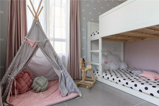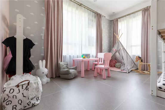 ▲兒童房在高級灰的空間基礎,搭配粉色調的軟裝布藝,營造出一個簡約浪漫的舒適感。