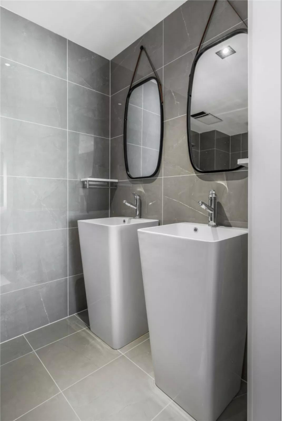 ▲雙人位的成品洗手盆+掛鏡,在灰色的的衛生間里,展示出一個簡潔時尚的衛浴空間。