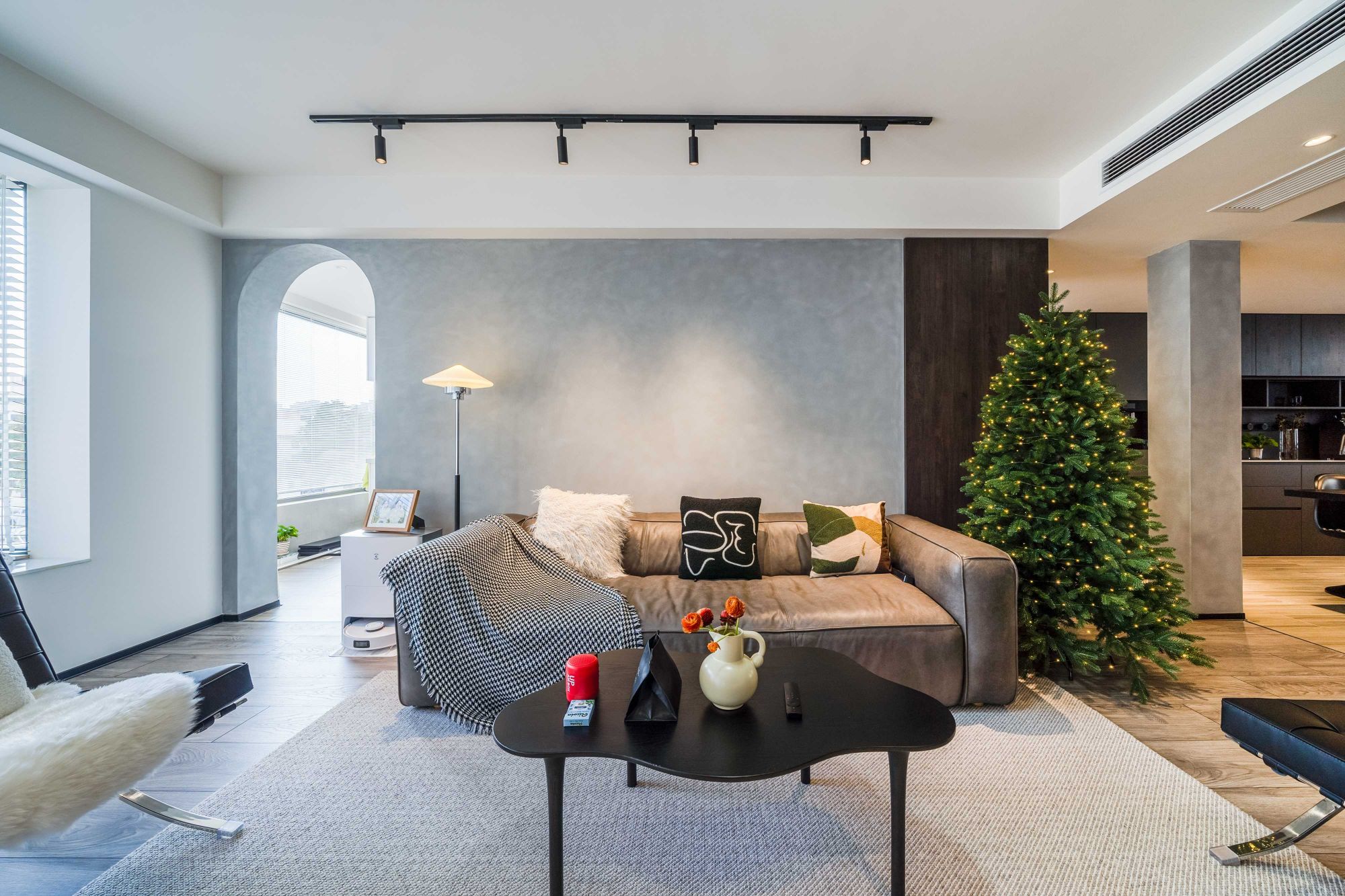 客廳整體以清新淡雅的空間氛圍,簡簡單單的電視墻,搭配一張白配綠的電視柜,還有一張小小的框架+原木的茶幾,靠近陽臺的地方還為貓咪準備了貓爬架,一眼看上去充滿了賞心悅目的氛圍感。