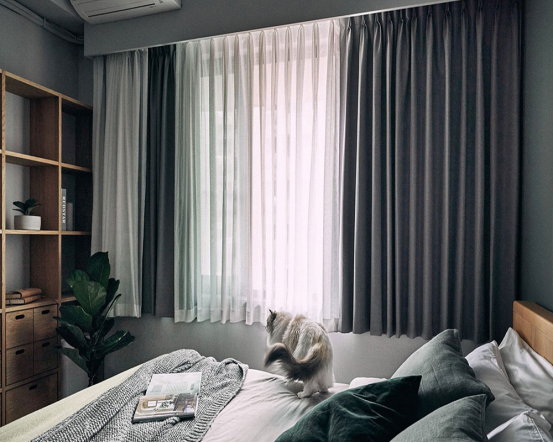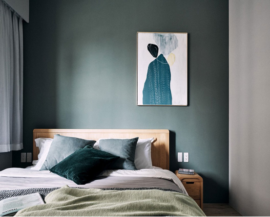 空間在深綠色墻面的基礎,配上白色的窗簾、白色的床單與藍色的抱枕,灰色,綠色的毯子,整體顯得格外的優雅情調。