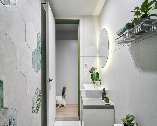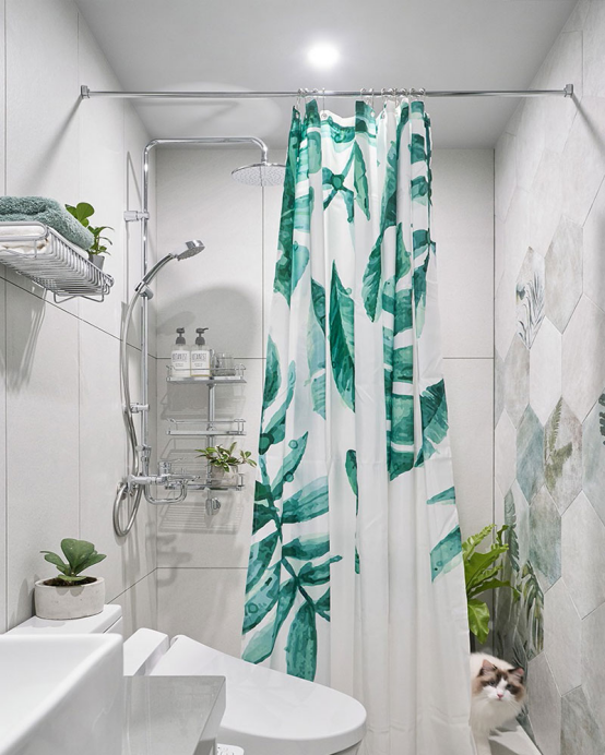 衛生間采用了掛壁式智能馬桶。在衛生間的淋浴部分用了網紅綠色花紋磚,并且用浴簾達到的干濕分離的效果!