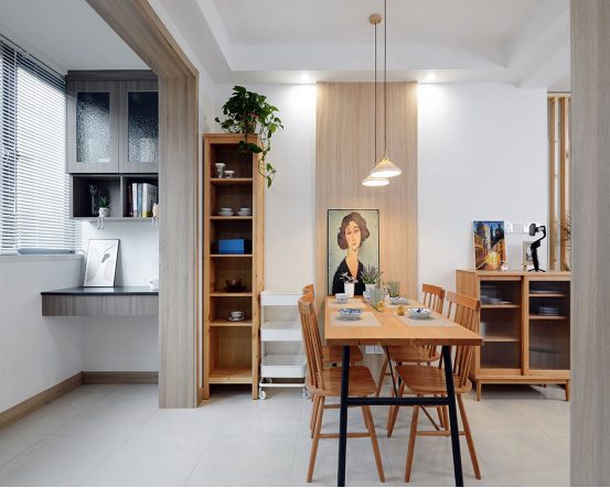 一整套原木色餐桌椅簡單舒適,搭配糧食油畫,既不單調(diào),又增加許多趣味性。