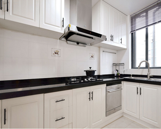 廚房用黑色石英石臺面來搭配白色櫥柜,讓整個空間看起來非常明亮,整潔大方!