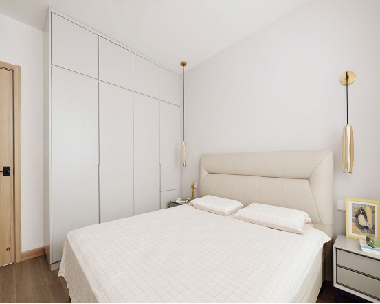 主臥搭配偏素淡,能讓人有心靈寧靜之感。房間里還設(shè)計了大衣柜,用來收納衣服,主臥采光度也十分棒。