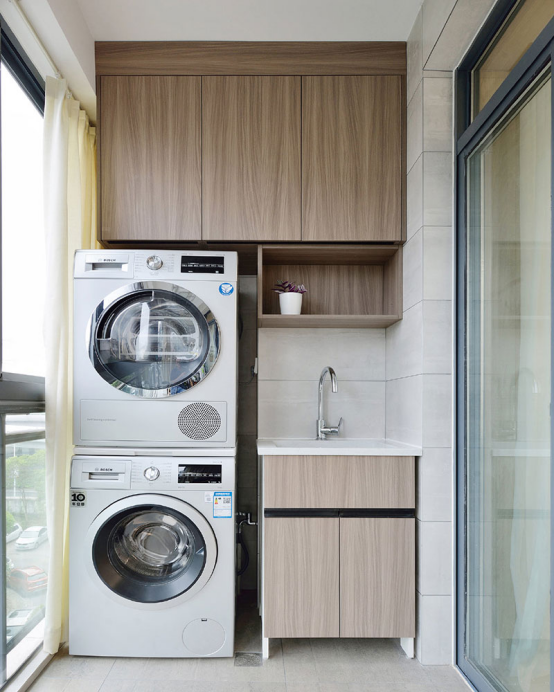 陽臺則是作為生活陽臺,洗衣晾曬方便。陽臺墻面還做了隔板收納,增大儲物空間。