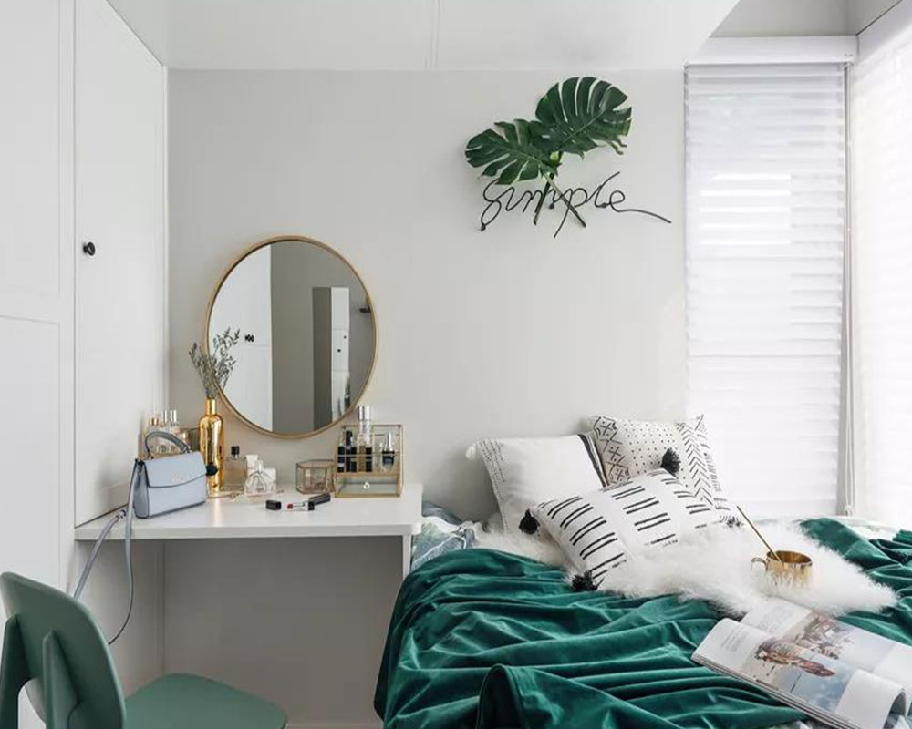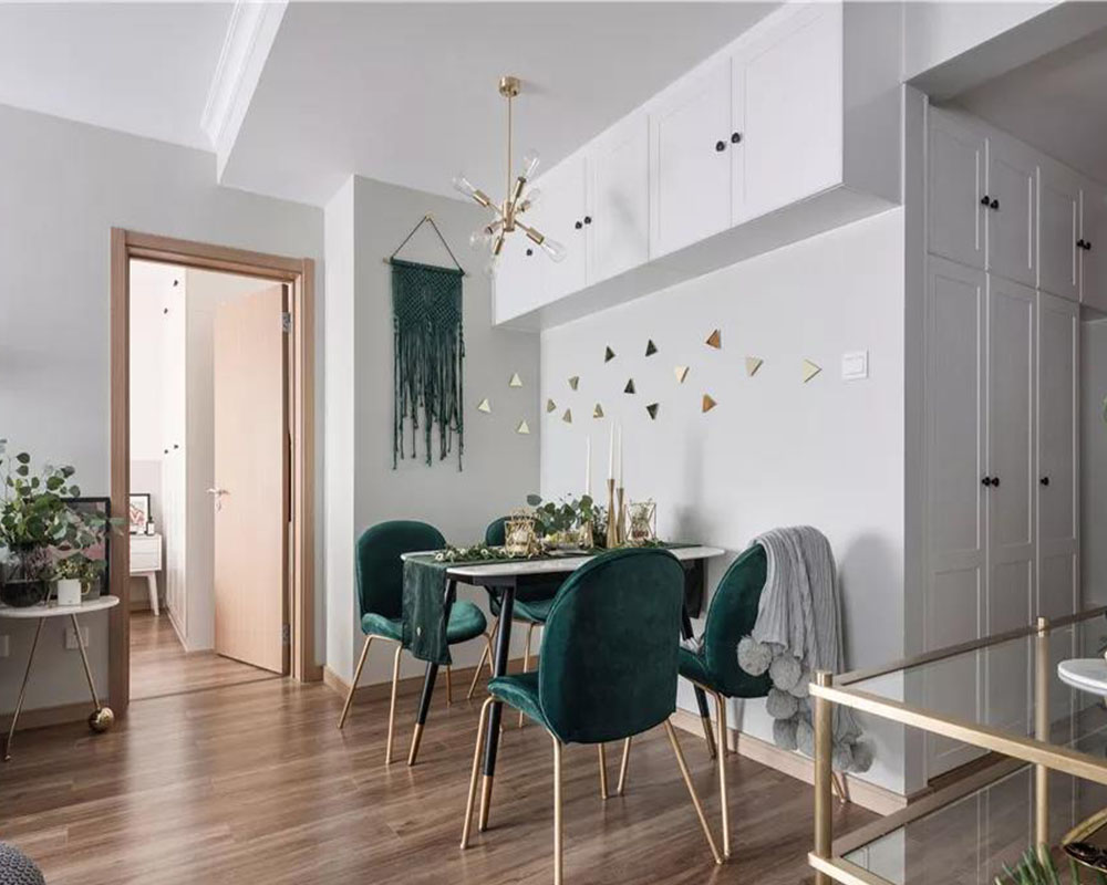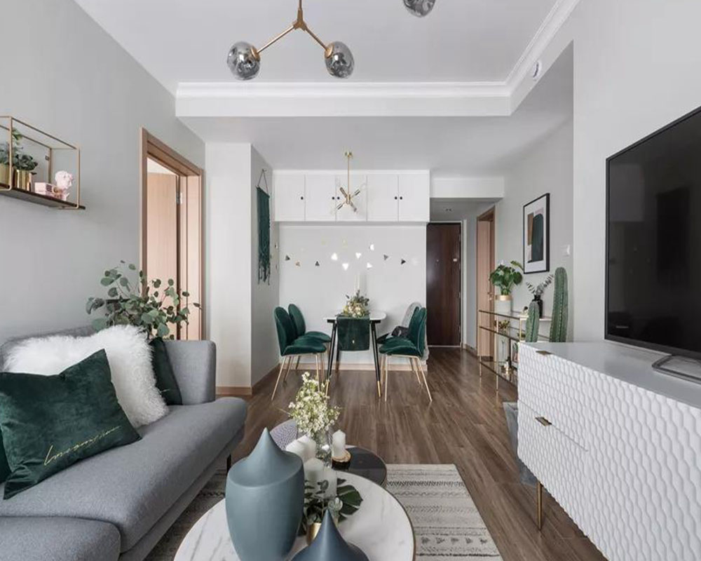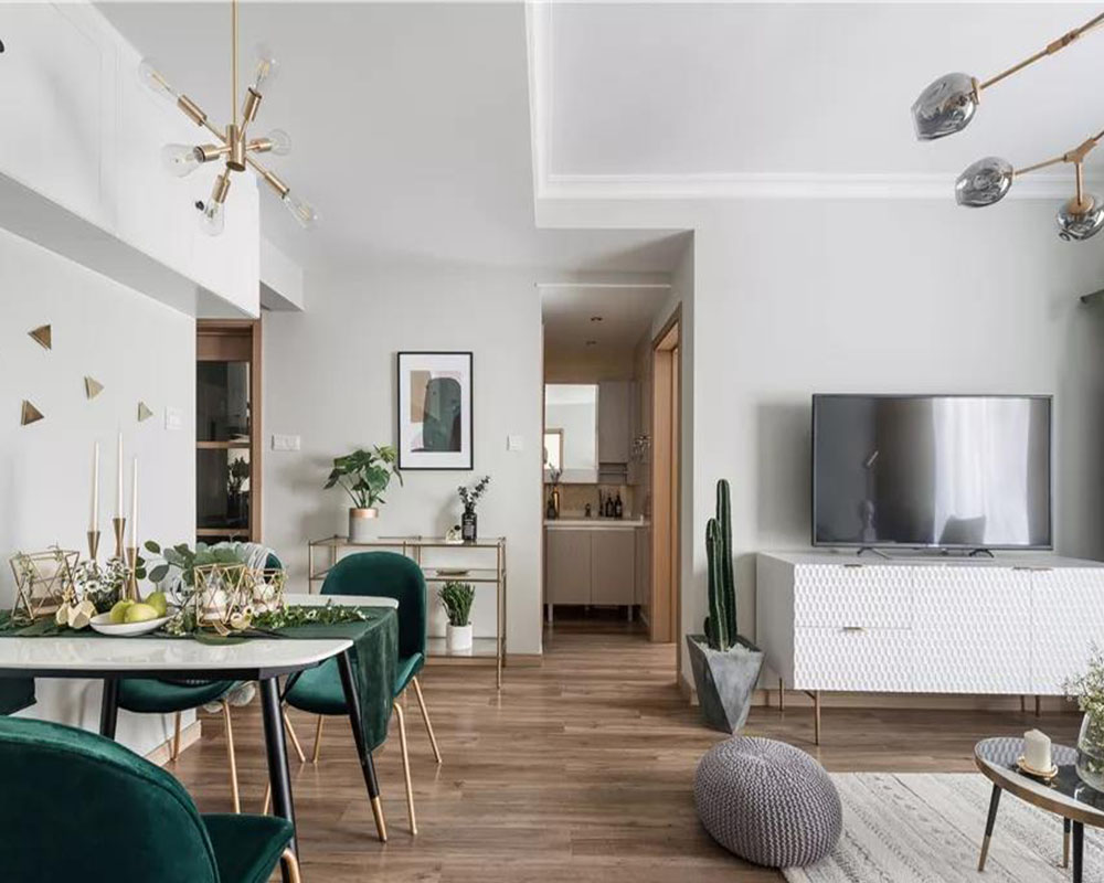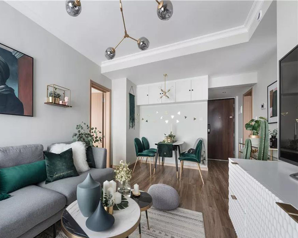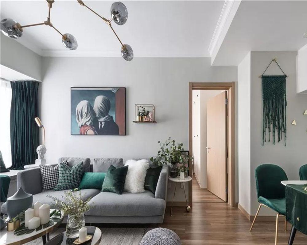 這是一套大概70平米的精裝小二房,房子的主人是90后女生,盡管年輕卻有著非凡脫俗的藝術追求,在不改變硬裝格局的基礎,以大膽的顏色與軟質質感,把這個小房子布置出北歐舒適與輕奢優雅的氛圍感,充滿了華麗與精致感。