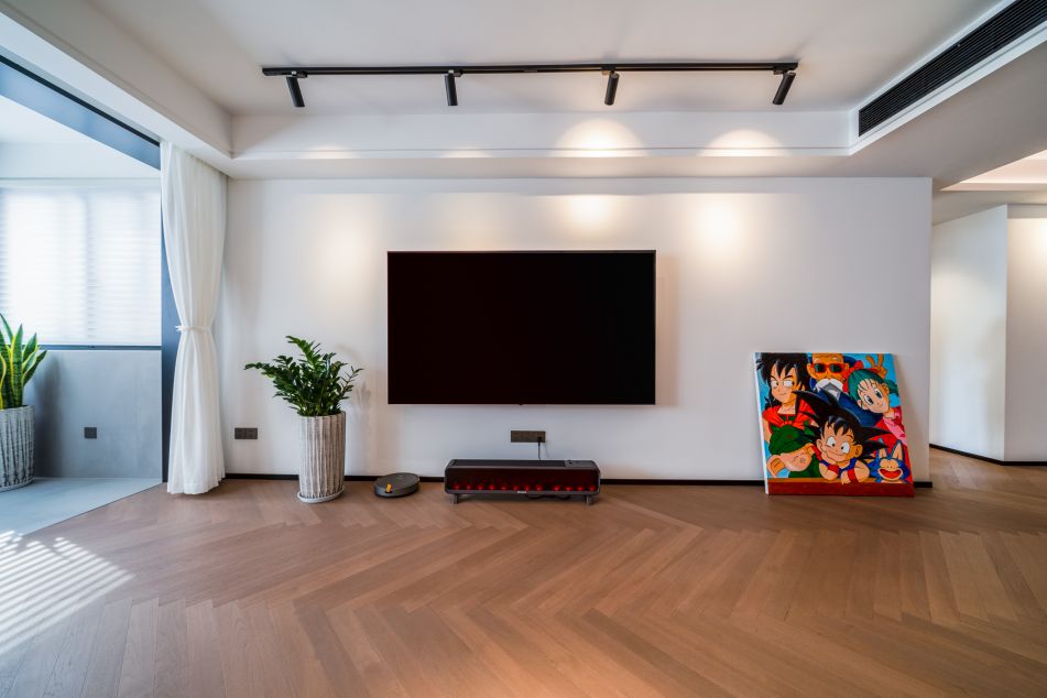 白色的主色調搭配了淺木色的地板,地板人字形鋪貼使空間看起來寬敞,且不失溫馨感。
