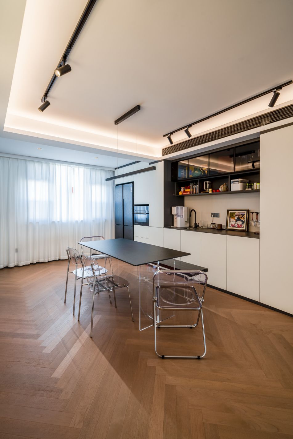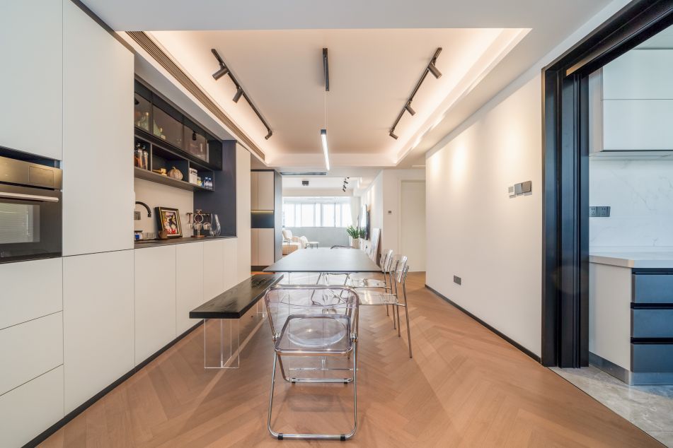 餐廳區域增加了一整面的儲物柜,中間一部分開放展示柜,滿足了日常生活中最頻繁、最實用的區域的收納工作。