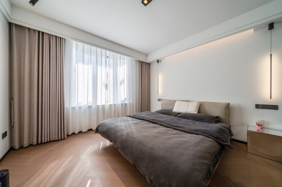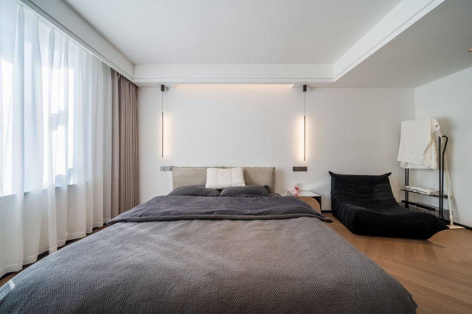 背景墻燈帶和床頭燈可以二選一打開,提升氛圍感;背景墻刷白,將極簡發揮到淋漓盡致。