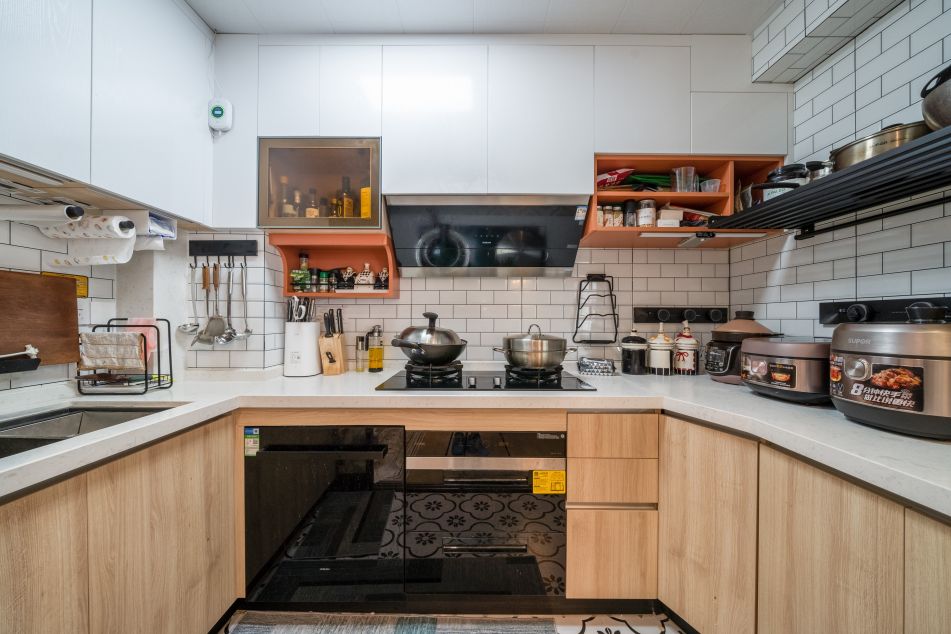 將廚房一分為二,烹飪區做傳統封閉式,以北歐風格定位,小白磚上墻,有擴大空間的視覺效果;櫥柜用白色吊柜搭配原木地柜,U型櫥柜增加收納及操作空間。