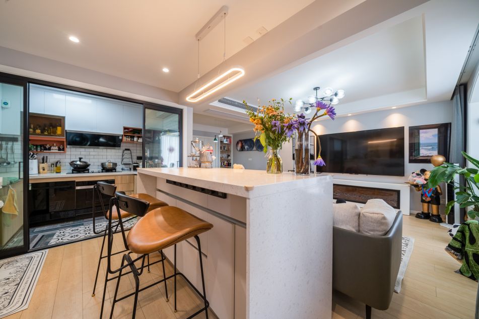 另一部分與客廳打通,靠客廳打造了一個吧臺;靠墻這面墻,一邊做擺放蒸、烤箱、冰箱的空間,以嵌入式的擺放看起來更整潔。另一邊則是櫥柜的延伸區。