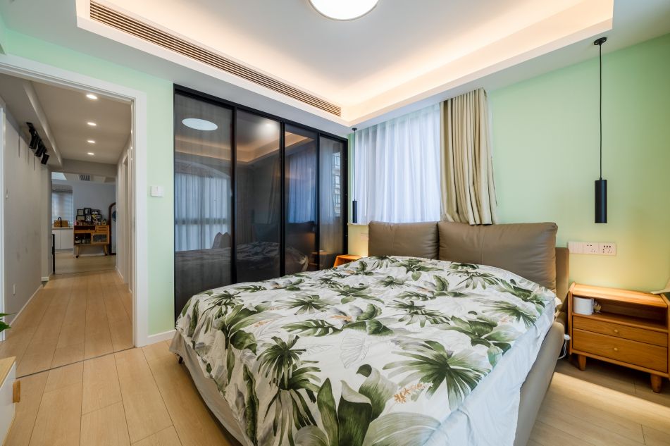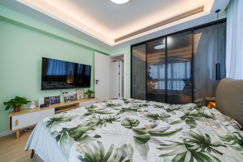 主臥有一個超大落地窗陽臺,再加上床北的大玻璃窗,使空間非常明亮;明亮的空間大膽的選用業主喜歡的綠色進行裝飾,充滿生機盎然。