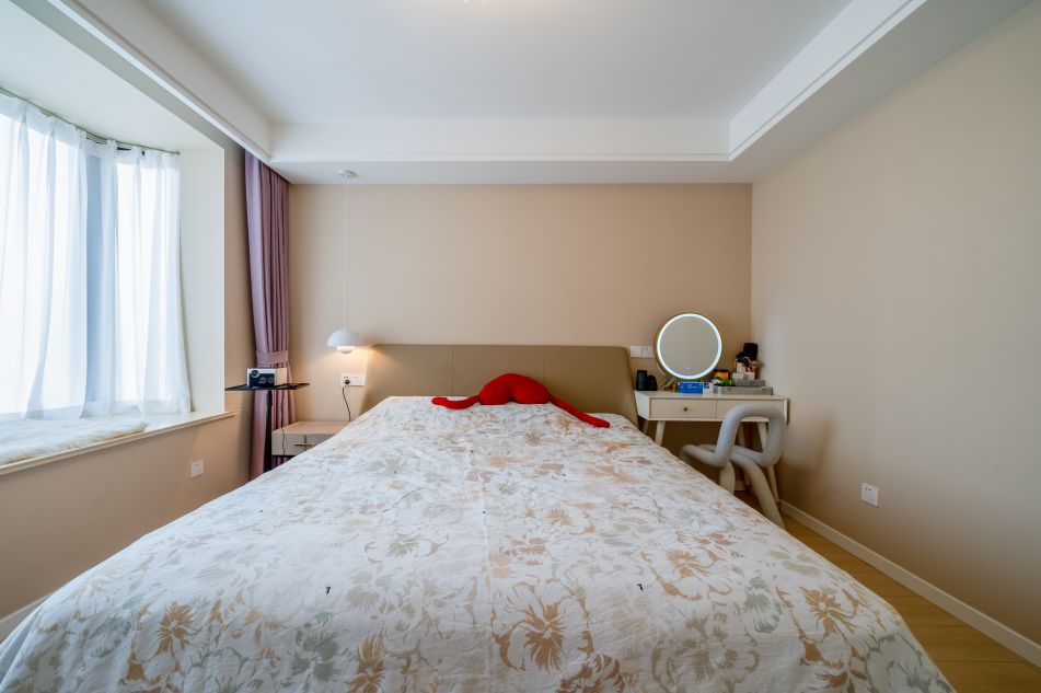 次臥相對比較溫馨,改用奶茶色刷新,床品搭配也比較溫馨。超大的飄窗讓次臥采光充足,也多了小憩的空間,冬天還能曬曬太陽。