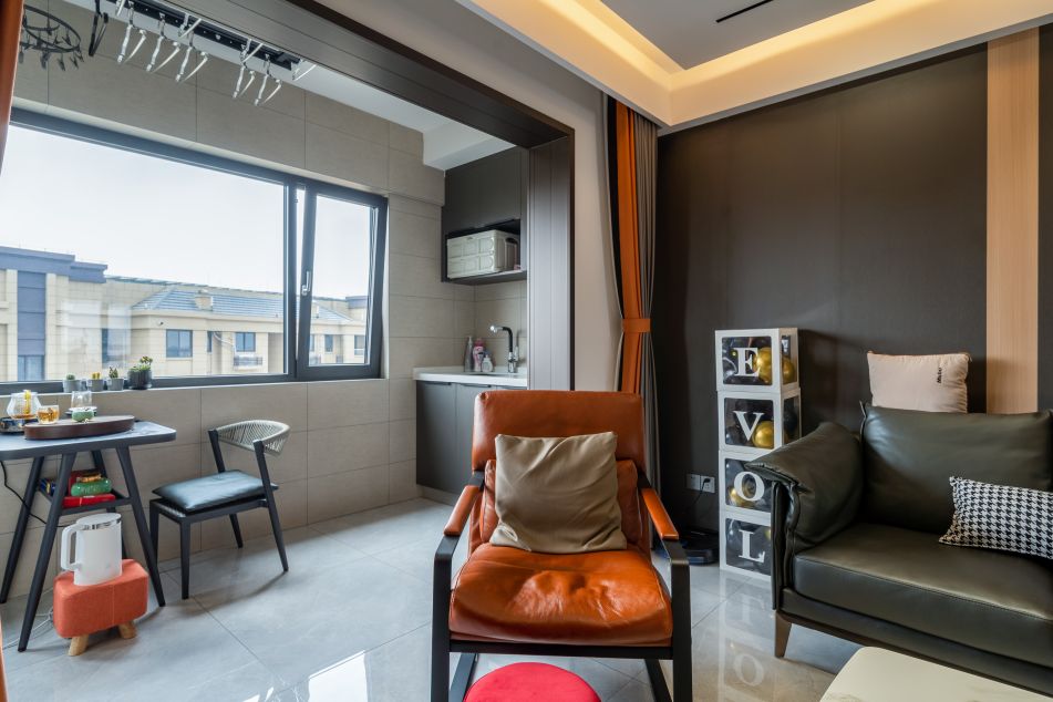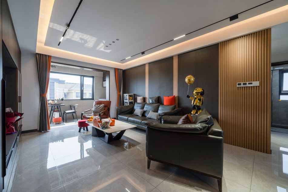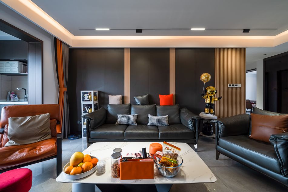 采用高級(jí)灰為整體基底,簡(jiǎn)單現(xiàn)代的生活質(zhì)感;橙色的單人沙發(fā)做為點(diǎn)綴,使空間不顯單調(diào),更有活躍。