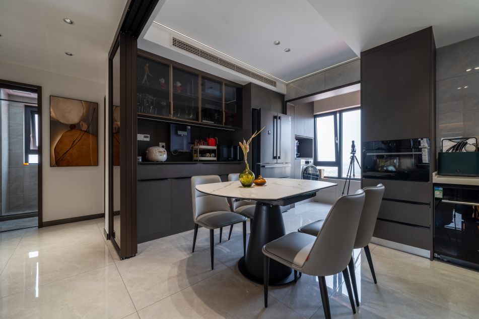簡(jiǎn)約時(shí)尚的餐桌椅,色調(diào)搭配和諧,現(xiàn)代感十足;開放式的布局,釋放了空間使用率,也讓空間融貫一體,營(yíng)造流暢的格局。