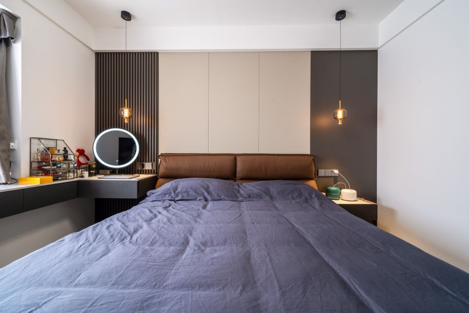 主臥延續(xù)了整體的風(fēng)格與色調(diào),兩邊對(duì)稱的床頭燈,暖黃色的光線,與空間材質(zhì)、造型疊加呈現(xiàn),凸顯精致空間氛圍感 。